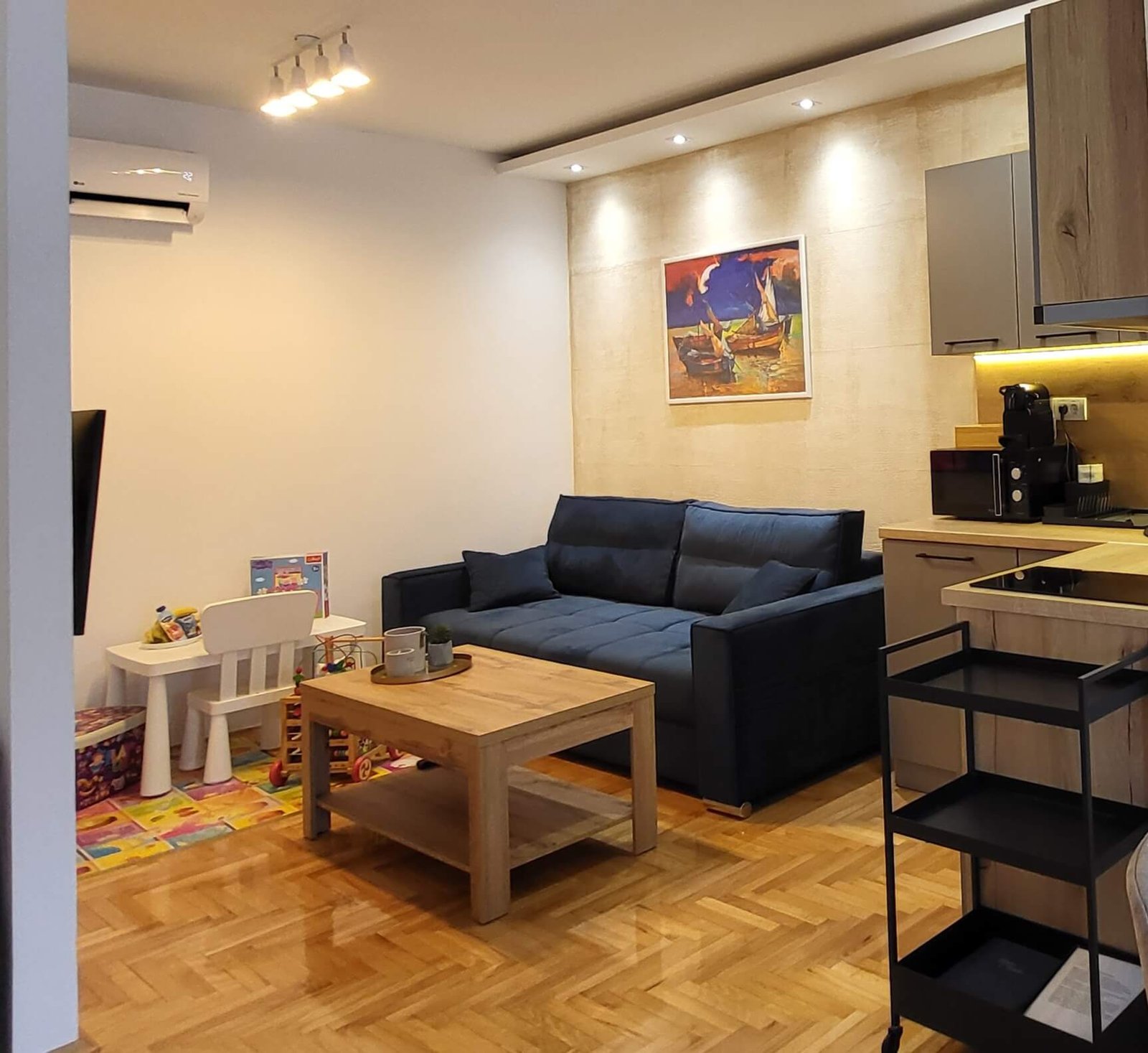 Klimatizovani apartmani osmišljeni da vam pruže maksimalnu udobnost i opuštanje tokom boravka. Prostran dnevni boravak nudi savršeno mesto za uživanje, dok potpuno opremljena kuhinja sa frižiderom i aparatom za kafu omogućava da se osećate kao kod kuće. Ceo apartman odiše toplinom i prijatnošću, pružajući idealno okruženje za nezaboravan odmor.